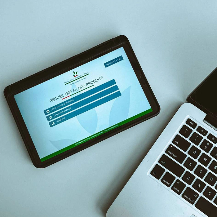 Fiches Produits, Recueil Tarifaire, and Catalogue Produits: Hybrid apps built with Ionic and AngularJS for agents and clients to browse product info, tariffs, and catalogs within bank agencies.